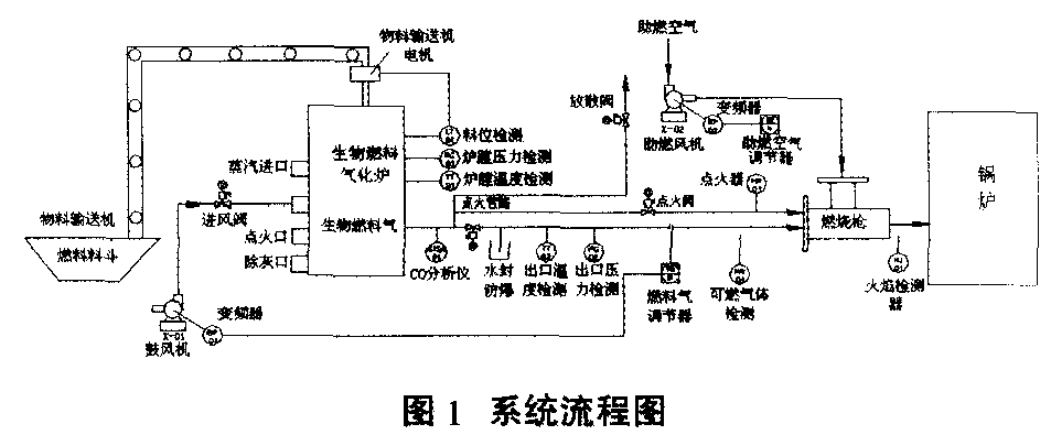 從表1中可看成其主要特性是:高揮發(fā)份、低灰分、低硫、熱值較低(一般只為常用燃煤的80%左右),容易著火,燃點低,燃燒溫度低,其化學(xué)成分中草木灰含堿金屬較大,容易結(jié)焦和發(fā)生堿腐蝕。 生物質(zhì)燃料工業(yè)鍋爐燃燒應(yīng)用主要采用直燃和氣化燃燒兩種方法。采取鍋爐直接燃燒容易產(chǎn)生黑煙及在受熱面上沉積焦油,其燃燒迅速,難以合理配風(fēng),燃燒溫度較難控制,且需要的爐膛容積較大,容易結(jié)焦,不易壓火,因此采用直燃燃燒方式難以組織穩(wěn)定燃燒,而且燃燒效率較低,不利于實現(xiàn)生物質(zhì)燃料的高效利用。 而利用生物質(zhì)氣化技術(shù)和裝備,使菌草生物質(zhì)顆粒燃料氣化后以氣態(tài)的方式送入鍋爐燃燒,是目前生物質(zhì)燃料高效清潔燃燒最有效的方法之一。但氣化燃燒應(yīng)用也存在其缺點:在生物質(zhì)氣化過程中會產(chǎn)生大量焦油,通常焦油中的能量一般占生物質(zhì)燃?xì)饪偰芰康?-15%,其在低溫下難以與可燃?xì)庖坏辣蝗紵?,降低了生物質(zhì)燃料的氣化效率。更重要的是由于焦油是一種復(fù)雜的可凝結(jié)烴類物質(zhì)的混合,其在低溫下凝結(jié)成液體,容易和水、炭粒等結(jié)合在一起,堵塞輸氣管道和閥門、腐蝕金屬,同時焦油燃燒時產(chǎn)生炭黑等顆粒對鍋爐設(shè)備損害相當(dāng)嚴(yán)重,且焦油及其燃燒后產(chǎn)生的氣味對人體也是有害的,因此在生物質(zhì)氣化燃燒過程中必須解決焦油裂解的問題,同時還應(yīng)對氣化燃?xì)獾妮斔秃腿紵踩右钥紤]。 2生物質(zhì)氣化反應(yīng)機理 生物質(zhì)氣化是以生物質(zhì)顆粒為原料,以氧氣(主要是空氣)、水蒸氣為氣化劑,在高溫條件下通過熱化學(xué)反應(yīng)將生物質(zhì)中可燃的部分轉(zhuǎn)換為可燃?xì)怏w的過程。生物質(zhì)氣化時產(chǎn)生的氣體,主要燃燒成分為CO、H2、CH4和部分烴類等,稱為生物質(zhì)燃?xì)?。氣化和燃燒過程是密不可分的,燃燒是氣化的基礎(chǔ),氣化是部分燃燒或缺氧燃燒。固體燃料中碳的燃燒為氣化過程提供了能量,氣化反應(yīng)其它過程的進行取決于碳燃燒階段的放熱狀況。實際上,氣化是為了增加可燃?xì)怏w的產(chǎn)量而在高溫狀態(tài)下發(fā)生的熱解過程。 生物質(zhì)氣化反應(yīng)包含氧化反應(yīng)、還原反應(yīng)、熱裂解反應(yīng)和燃料的干燥等四個過程,而生物質(zhì)氣化的主要反應(yīng)發(fā)生在氧化層和還原層,因此稱氧化層和還原層為氣化層。在實際氣化過程中上述四個區(qū)域是沒有明顯邊界,是相互滲透和交錯的。 3菌草生物質(zhì)固定床氣化燃燒系統(tǒng)的開發(fā) 3.1菌草生物質(zhì)固定床氣化燃燒系統(tǒng)流程 針對生物質(zhì)顆粒燃料的生物特性和燃燒特點,我院技術(shù)人員開發(fā)出一種新型生物質(zhì)固定床氣化燃燒系統(tǒng),使其能很好地應(yīng)用于工業(yè)鍋爐燃燒,該系統(tǒng)包括生物質(zhì)燃料顆粒的制氣、輸送和燃燒應(yīng)用的整個過程。系統(tǒng)主要設(shè)備有固定床氣化爐、下料裝置、氣化爐配套鼓風(fēng)機、燃?xì)廨斔凸艿馈㈠仩t燃燒機及其點火和火焰檢測器、燃燒器配套鼓風(fēng)機、水封裝置、CO檢測儀和燃?xì)夥派⒐?、點火和小槍管路、自動控制裝置等。本系統(tǒng)流程圖如圖1所示。