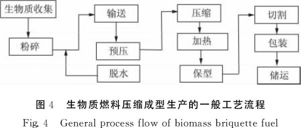 工藝方面。生物質(zhì)固化成型工藝有多種形式,根據(jù)其主要工藝特性的差別,可分為濕壓成型、熱壓成型、冷壓成型和碳化成型4種基本類型。 ?。?)濕壓成型就是先對(duì)生物質(zhì)能原料進(jìn)行一定程度的腐化,即增加原料的熟化程度,然后擠壓成型,其成型性能會(huì)有一定的改善,但存在有能量損失、成型燃料密度低、成型模具磨損較快等缺陷,并且成型產(chǎn)品還要經(jīng)過干燥才能存放,致使成本升高。 (2)熱壓成型是目前普遍采用的成型工藝,壓縮過程中加熱,一方面可使原料中含有的木質(zhì)素軟化,起到黏結(jié)劑的作用,另一方面還可使原料本身變軟,容易壓縮,但加熱的同時(shí)也增加了其功率的損耗,并且只有加熱到220~260℃之間才能較快成型,這樣不但耗能大而且對(duì)設(shè)備損壞嚴(yán)重,成型顆粒還需要經(jīng)過專門的冷卻干燥設(shè)備處理,才能包裝儲(chǔ)存。 ?。?)冷壓成型是近年來研究利用的一種生物質(zhì)成型工藝,成型時(shí)原料和機(jī)器部件之間的摩擦作用能使原料加熱到100℃左右,也能起到軟化木質(zhì)素的作用,并且在一定程度上解決了以往成型設(shè)備對(duì)含水率和加熱溫度要求的限制,但其成型所需壓力偏高,達(dá)幾十個(gè)兆帕,也存在耗能大和設(shè)備損耗嚴(yán)重的問題。 (4)碳化成型主要是制得機(jī)制木炭,與本文使用方向不同,不做討論。 本課題組綜合考慮冷、熱壓縮成型工藝的特點(diǎn),一定程度上降低熱壓溫度、提高壓力。通過改進(jìn)的熱壓成型試驗(yàn),考察了玉米秸稈、鋸末、棉桿3種典型原料的影響因素,找出的最佳成型范圍為:粒度0~2mm、含水率15%~23%、溫度130~150℃和長(zhǎng)徑比5.28,并通過微觀角度探討了不同成型條件下顆粒的微觀型貌,其微觀特征與試驗(yàn)結(jié)果相符。 在本課題組設(shè)計(jì)立式環(huán)模成型機(jī)時(shí),充分考慮了以上最佳工藝參數(shù)。改進(jìn)的熱壓成型工藝,實(shí)現(xiàn)了節(jié)能降耗、延長(zhǎng)設(shè)備使用壽命的目的,從而增強(qiáng)了生物質(zhì)顆粒燃料的市場(chǎng)競(jìng)爭(zhēng)力。 生物質(zhì)燃料壓縮成型生產(chǎn)的一般工藝流程如圖4所示。步驟如下: ?。?)從加工廠附近收集生物質(zhì); ?。?)通過粉碎機(jī)粉碎至一定的粒度; ?。?)對(duì)原料進(jìn)行干燥處理,使含水率處于最佳范圍; (4)輸送原料的螺旋推進(jìn)器可同時(shí)做預(yù)壓工作,提高生產(chǎn)率; (5)在模具和環(huán)模的共同作用下壓縮成型; ?。?)在成型過程中對(duì)原料進(jìn)行加熱,提高成型性能; ?。?)對(duì)成型顆粒進(jìn)行保型,穩(wěn)定其形狀; (8)對(duì)成型顆粒進(jìn)行切割、包裝和儲(chǔ)運(yùn)處理,供應(yīng)市場(chǎng)。