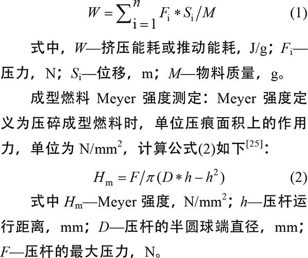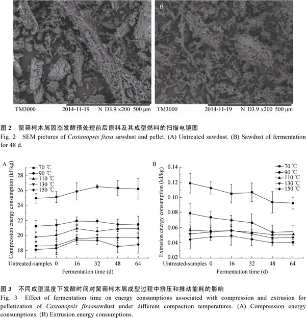 1.2.2黧蒴栲固態(tài)發(fā)酵 稱取30g預處理后的黧蒴栲木屑為固體基質(zhì),裝于500mL錐形瓶中,分別加入164mL液體基質(zhì)和0.6g吐溫80配成含水率為85%的固態(tài)培養(yǎng)基,滅菌。將濃度為2.0×106個/mL的菌懸液以0.8%的質(zhì)量比接種入已滅菌的發(fā)酵瓶中,于37℃培養(yǎng)。將滿足發(fā)酵時間(0、16、32、48、64d)的黧蒴栲在40℃烘干,并測其含水率,當含水率在5%左右時,向其中加入13%的水,裝袋密封,于4℃穩(wěn)定48h。其中所用液體基質(zhì)的組成成分為:KH2PO4 2.0g/L,MgSO4·7H2O 0.5g/L,酒石酸銨0.2g/L,微量元素液70mL/L。其中,微量元素液(g/L):NaCl 1.0,CoCl2·6H2O 0.18,Na2MoO4·2H2O 0.01,ZnSO4·7H2O 0.1,CaCl2 0.1,CuSO4·5H2O 0.01,MnSO4·H2O 0.5,F(xiàn)eSO4·7H2O 0.1,KAl(SO4)2·12H2O 0.01,MgSO4·7H2O 3,H3BO3 0.01,氮三乙酸1.5。 1.3黧蒴栲成型實驗 1.3.1成型設備和過程 單顆粒成型實驗機由WDW-10電子萬能實驗機改裝,裝置包括夾套(D=7mm,L=80mm)、壓桿(D=6.80mm,L=120mm)以及2個不銹鋼墊片(厚2mm和20mm)。成型過程具體如下,打開單顆粒成型實驗機的溫度控制器,使夾套內(nèi)壁溫度升至設定成型溫度(70?150℃),保持120min,待內(nèi)壁溫度穩(wěn)定后在壓制槽底部放入不銹鋼墊片,稱取1g左右調(diào)配好的含水率為15%的樣品放入夾套中。采用程序控制壓桿,設定壓桿下行速度為8mm/min,當壓桿受力達到初級設定值(500MPa)時,下行速度變?yōu)?mm/min,當壓桿受力達到98MPa后停留30s,停止壓桿下行程序,取出不銹鋼底板。隨后,系統(tǒng)控制壓桿以2mm/min由0MPa開始下行,將制成的成型燃料推出壓制槽[2]。制成的成型燃料迅速用冷風冷卻至室溫。每次實驗結束后,用丙酮清洗模具并擦拭干凈。實驗至少重復8次。 1.3.2生物質(zhì)成型燃料能耗計算與特性分析 能耗計算:生物質(zhì)成型過程中的能耗包括擠壓和推動能耗,擠壓能耗(Compression energy consumption)表示成型燃料成型過程中壓桿所做的功。推動能耗(Extrusion energy consumption)表示成型燃料成型之后,壓桿在對成型燃料施力到開始推動成型燃料的過程中所做的功,單位為kJ/kg,計算公式如下[2]: