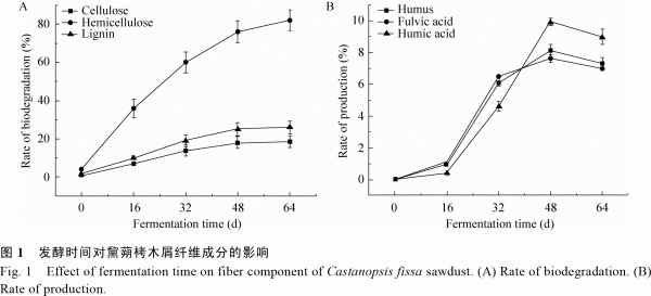 1.4黧蒴栲木屑發(fā)酵前后的化學成分定量分析 采用范式纖維素測定法測定原料木質(zhì)纖維素各成分含量;采用0.1mol/L焦磷酸鈉與0.1mol/L氫氧化鈉混合提取劑提取原料中的腐殖質(zhì)并測定各成分含量;采用元素分析儀(VarioELIII)進行原料元素分析,根據(jù)GB/T 28731-2012進行原料工業(yè)分析[26],采用湖南林業(yè)科學院熱值測定儀(SUNDY)SDACM5000進行原料熱值測定[16]。 2結果與討論 2.1固態(tài)發(fā)酵過程對黧蒴栲木屑中木質(zhì)纖維素和腐殖質(zhì)含量的影響 通過對不同發(fā)酵時間的黧蒴栲木屑中纖維成分(纖維素、半纖維素和木質(zhì)素)和腐殖質(zhì)(腐殖酸、富里酸和胡敏酸)含量的測定,并與新鮮黧蒴栲木屑進行對比發(fā)現(xiàn),半纖維素降解率顯著高于纖維素和木質(zhì)素,如圖1A所示。這主要是由木屑中木質(zhì)纖維素組成結構的特殊性造成的[16],木質(zhì)纖維素由木質(zhì)素、纖維素和半纖維素組成:通過碳-碳鍵將苯基丙烷結構單元連接而成的具有空間網(wǎng)狀結構的木質(zhì)素具有完整堅硬的“外殼”,不易被微生物降解,無法形成可發(fā)酵性糖類;以聚集態(tài)存在的纖維素則是由大量葡萄糖基構成的鏈狀高分子化合物,其晶體結構阻礙纖維素的降解;由較短且高度分枝的雜多糖鏈組成的半纖維素的結構單元主要有木糖、甘露糖、葡萄糖、阿拉伯糖和半乳糖等,聚合度較低,比較容易被微生物降解。因此,在固態(tài)發(fā)酵過程中,P.chrysosporium優(yōu)先利用黧蒴栲木屑中的半纖維素及其他易利用的營養(yǎng)物質(zhì)作為營養(yǎng)源來進行自身的繁殖和生長[15-16],使得黧蒴栲木屑變得“疏松”,空隙增大。木屑中的大粒徑微粒數(shù)量減少,且木屑表面由光滑變粗糙,正如掃描電鏡圖2A和圖2B所示。隨著發(fā)酵時間的延長,微生物開始分解纖維素和木質(zhì)素,并生成腐殖質(zhì)(腐殖酸、富里酸、胡敏酸)、糖類、CO2、水和其他中間小分子產(chǎn)物[16]。圖1B表示隨著發(fā)酵時間的延長,木屑中腐殖質(zhì)主要成分的變化規(guī)律。在圖1中,當發(fā)酵時間超過48d時,木質(zhì)纖維素降解率和腐殖質(zhì)產(chǎn)生率開始降低。這可能是因為在固態(tài)發(fā)酵后期,微生物死亡率升高,其產(chǎn)酶能力下降,從而抑制了木質(zhì)纖維素的降解,同時碳源極度缺乏,微生物開始利用腐殖質(zhì)碳[16]。