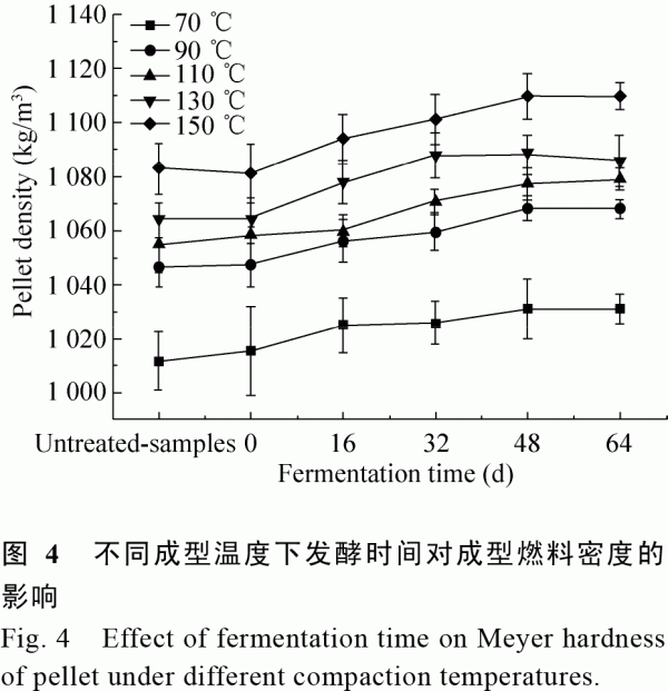 2.2不同成型溫度下發(fā)酵時間對黧蒴栲木屑成型過程中擠壓和推動能耗的影響 如圖3所示,在同一成型溫度下,經(jīng)固態(tài)發(fā)酵的黧蒴栲木屑在成型中的擠壓能耗高于新鮮黧蒴栲木屑。例如,在70℃下成型的新鮮黧蒴栲木屑的擠壓能耗為24.95kJ/kg,而發(fā)酵48d的木屑的擠壓能耗為26.29kJ/kg,擠壓能耗升高了5.37%,而推動能耗則呈相反的趨勢。同時,當成型溫度固定時,隨著發(fā)酵時間延長,擠壓能耗呈先增加后降低的趨勢。當發(fā)酵時間短于16d,擠壓能耗呈升高趨勢,最高可升高7%。 當發(fā)酵時間長于16d時,擠壓能耗開始降低,而推動能耗則總體呈現(xiàn)降低的趨勢。這是因為固態(tài)發(fā)酵過程中,P.chrysosporium優(yōu)先利用黧蒴栲木屑中的半纖維素,使得半纖維素的降解速率高于纖維素和木質(zhì)素的降解速率(圖3A),從而相對降低了半纖維素的含量,提高了纖維素和木質(zhì)素的含量,并生成腐殖質(zhì)和其他一些小分子物質(zhì)。同時,固態(tài)發(fā)酵過程在一定程度上破壞木質(zhì)纖維素的天然結構,并使黧蒴栲木屑表面產(chǎn)生一些“分枝”。半纖維素相對含量的降低,導致木屑的韌性降低[3]。木屑微粒表面產(chǎn)生的這些“分枝”在擠壓成型過程中,互相搭接和阻礙,提高了壓桿所受的阻力。這種降低的韌性和提高的阻力導致發(fā)酵木屑的擠壓能耗升高。 另外,木質(zhì)素和腐殖質(zhì)被普遍認為是生物質(zhì)天然的黏結劑[8],富含形成“氫鍵”的官能團,能夠在壓力和溫度的共同作用下被“擠入”木屑纖維“搭接”而成的“網(wǎng)格”中,通過“氫鍵”和“固體搭橋”作用,限制木屑微粒在“網(wǎng)格”中的相對移動。因此,在推動過程中,成型燃料對模具內(nèi)壁的摩擦力降低,使得推動能耗降低。 成型溫度也是影響木屑成型行為的主要因素之一。由圖3可知,當同一固態(tài)發(fā)酵時間時,木屑的擠壓和推動能耗均隨著成型溫度的升高而降低。其中,當溫度在70?90℃范圍內(nèi),擠壓和推動能耗隨溫度升高明顯降低;當溫度高于130℃時,溫度的進一步升高不能使擠壓和推動能耗發(fā)生明顯的變化。這是因為木質(zhì)素是熱塑性的物質(zhì)[6]。當發(fā)酵時間固定時,隨著溫度的升高,木質(zhì)素一般在70℃開始軟化,90℃以后發(fā)生玻璃化轉化,流動態(tài)加強,木屑的粒子二向平均徑變大[18]。當成型溫度超過130℃時,玻璃化轉化完全,進一步地升高成型溫度不能使流動態(tài)繼續(xù)加強[2]。在壓力的作用下,玻璃化的木質(zhì)素被擠入木屑纖維構成的框架結構中,木屑微粒開始重新排列位置關系,并發(fā)生機械變形和塑性流變[23],使得粒子更緊密地黏結在一起,減少成型燃料膨脹對壓槽壁面的擠壓作用,降低推動能耗。另外,微粒之間以及微粒與壁面之間的摩擦力也是影響推動能耗的一個主要因素[8],成型溫度越高,成型燃料表面越光滑,與壁面的摩擦力越小,成型過程中推動能耗越低。 2.3不同成型溫度下發(fā)酵時間對成型燃料密度的影響 單個成型燃料的密度與大量成型燃料的堆積密度呈正相關關系,并影響成型燃料的能量密度和儲運成本,是成型燃料的重要參數(shù)[8]。如圖4所示,當成型溫度固定時,隨著發(fā)酵時間延長,成型燃料密度增加。例如,在成型溫度150℃時,以新鮮黧蒴栲和發(fā)酵16、32、48以及64d的黧蒴栲木屑制備的成型燃料的密度分別為1063.90、1078.01、1087.85、1091.11、1091.00kg/m3。這是因為固態(tài)發(fā)酵處理使黧蒴栲木屑變得疏松,空隙變大,呈纖維束狀。與新鮮木屑緊密的抗壓縮結構相比,這種纖維束狀結構在成型過程中易被壓縮而降低成型燃料體積。同時,如圖2B所示,固態(tài)發(fā)酵后的木屑表面更加粗糙,木質(zhì)素和部分固態(tài)發(fā)酵產(chǎn)物(腐殖質(zhì)和低分子糖類等)在壓力和溫度的作用下,“填充”木屑粗糙的表面及其孔洞,有利于木屑成型燃料密度的提高。此外,在同一發(fā)酵時間條件下,成型燃料的密度隨著成型溫度的升高而提高。當溫度從70℃升高到90℃時,成型燃料密度最大可增加4%,而當溫度升到150℃時密度最大可增加8%。這是因為在較高成型溫度下,木質(zhì)素軟化程度提高,流動性增強。在受壓條件下,木質(zhì)素較易流動擴散,使生物質(zhì)微粒更加緊密膠結,空隙減小,提高成型燃料的密度[23]。