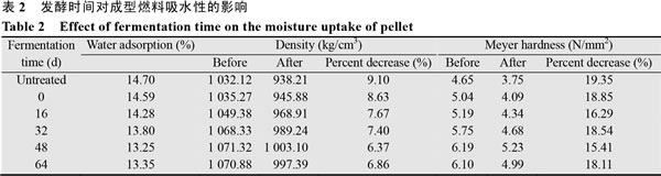 當溫度從70℃升到90℃時,成型燃料Meyer強度最大可增加12%,90℃升到130℃時成型燃料強度變化不明顯,繼續(xù)增加到150℃時成型燃料強度又明顯增大,最大可增加30%。這主要是因為木質(zhì)素一般在70℃開始軟化,90℃以后木質(zhì)素發(fā)生玻璃化轉化,流動態(tài)加強,130℃時轉化完全,其后流動態(tài)不會得到加強,而木質(zhì)素的軟化程度和流動態(tài)強度影響成型燃料的Meyer強度。 2.5發(fā)酵時間對成型燃料吸水性的影響 以在130℃下成型的成型燃料為例,發(fā)酵時間對成型燃料吸水性的影響如表2所示,隨發(fā)酵時間延長,成型燃料吸水性降低,48d時基本達到穩(wěn)定。對吸水實驗前后成型燃料的密度、Meyer強度進行對比可知,固態(tài)發(fā)酵有利于黧蒴栲木屑成型燃料的儲藏。這是因為通過固態(tài)發(fā)酵過程可以降解生物質(zhì)中最具有化學活性的成分——半纖維素,以降低生物質(zhì)中吸水基團羥基的含量,從而降低生物質(zhì)成型燃料的吸水性。同時,固態(tài)發(fā)酵使木屑中木質(zhì)素的相對含 量升高并生成腐殖質(zhì)和糖類等物質(zhì),能夠在成型過程中,被“擠進”木質(zhì)纖維素結構間的空隙,并通過自身較多的官能團與木屑構成氫鍵和靜電引力,加強固體粒子橋接或架橋和填充或嵌合,成型燃料微粒之間結合得更加緊密,空隙減小,使得水分難以滲入。