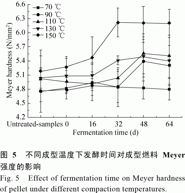 2.4不同成型溫度下發(fā)酵時間對成型燃料Meyer強度的影響 如圖5所示,當發(fā)酵時間短于16d,溫度和發(fā)酵時間對成型燃料Meyer強度的影響均不明顯。這可能是因為發(fā)酵前期黧蒴栲木屑成分變化較小,特別是木質(zhì)纖維素含量幾乎沒有變化(圖1A),而溫度主要影響木質(zhì)素的軟化。當發(fā)酵時間超過16d,發(fā)酵時間和溫度均對成型燃料的強度有明顯的影響。在相同成型溫度條件下,隨著發(fā)酵時間的延長,成型燃料Meyer強度呈升高趨勢。這主要是因為發(fā)酵16d后木屑木質(zhì)纖維素結構被部分破壞,部分半纖維素被分解,使得木屑中木質(zhì)素含量相對升高,而木質(zhì)素是木屑中天然的黏結劑,在壓縮成型過程中,木質(zhì)素能夠在溫度與壓力的共同作用下發(fā)揮黏結劑功能,粘附和聚合生物質(zhì)成型燃料,提高了成型物的結合強度和耐久性[24]。然而,當成型溫度低于90℃時,木質(zhì)素沒有充分軟化,黏結作用不明顯。當發(fā)酵時間超過32d時,成型溫度對成型燃料Meyer強度的影響較大。