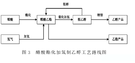 該技術(shù)生產(chǎn)一噸乙醇需消耗1.345噸醋酸,1018Nm3氫氣,產(chǎn)391千克水。 公用工程介質(zhì)噸產(chǎn)品單耗為:冷卻水106噸,電90kW·h,燃料煤0.31噸,儀表空氣25Nm3。醋酸成本3000元/噸,氫氣1.2元/Nm3計(jì),噸乙醇物耗成本5698元。 3.2.3醋酸酯化加氫技術(shù) 該技術(shù)以西南化工研究院為代表,已經(jīng)過(guò)小試、中試試驗(yàn),西南化工研究院與河南順達(dá)化工科技有限公司簽訂“20萬(wàn)噸酯化加氫制乙醇”合作協(xié)議,裝置已于2016年6月投產(chǎn)。 工藝路線如圖3。