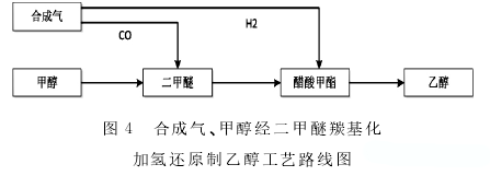該技術(shù)可得到乙醇、乙酯兩種產(chǎn)品,兩種產(chǎn)品的比例可進(jìn)行調(diào)整。產(chǎn)品為乙醇時(shí),噸乙醇醋酸耗量1.36噸,氫氣1025Nm3;產(chǎn)品為乙酯時(shí),噸乙酯醋酸耗量1.37噸,氫氣10Nm3。公用介質(zhì)噸乙醇消耗情況為:蒸汽3.6噸,電160kW·h,循環(huán)水350噸,冷凍水12噸,儀表空氣20Nm3,氮?dú)?Nm3。醋酸成本3000元/噸,氫氣1.2元/Nm3計(jì),噸乙醇物耗成本6031元。 3.2.4合成氣、甲醇經(jīng)二甲醚羰基化加氫還原制乙醇技術(shù) 該技術(shù)以大連化物所為代表,大連化物所與陜西興化集團(tuán)公司合作規(guī)模為10萬(wàn)噸/年裝置已投產(chǎn),規(guī)模為20萬(wàn)噸/年與50萬(wàn)噸/年工藝包已編制完成。 工藝路線如圖4。